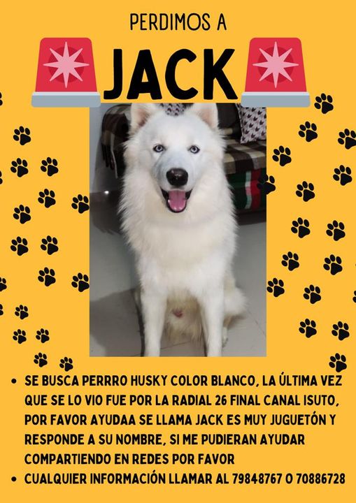 Se busca perro Husky Color blanco, la última vez que se lo vio fue por la radial 26 final canal Isuto, se llama Jack es muy juguetón y responde a su nombre, su familia está muy angustiada. Si tiene algún dato comunicarse al 79848767 o 70886728.