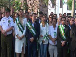 bandera cruceña en la plaza 24 de Septiembre. En este acto, estuvieron presentes autoridades cívicas, policiales, eclesiásticas y departamentales.El alcalde Jhonny Fernández hizo un llamado a la paz y a evitar conflictos,