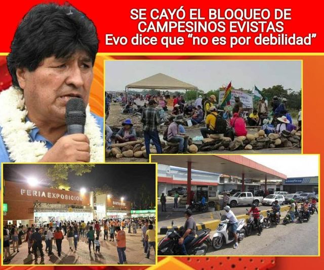 El temido bloqueo no se producirá. Los campesinos evistas tenían que comenzar a bloquear hoy. Hubo rechazo a la medida. Y lo suspendieron. Evo dice que no “no fue por debilidad”. El bloqueo iba a realizarse en el mes de Santa Cruz y de la Expocruz.