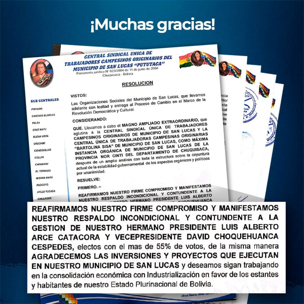 Nuestro Gobierno seguirá apostando por la unidad. Hagamos causa común por el Proceso de Cambio, la democracia y crecimiento con justicia social de la Patria. Gracias por su apoyo hermanas «Bartolina Sisa» y hermanos trabajadores campesinos del municipio de San Lucas, #Chuquisaca. https://t.co/qyxU2xEFIs