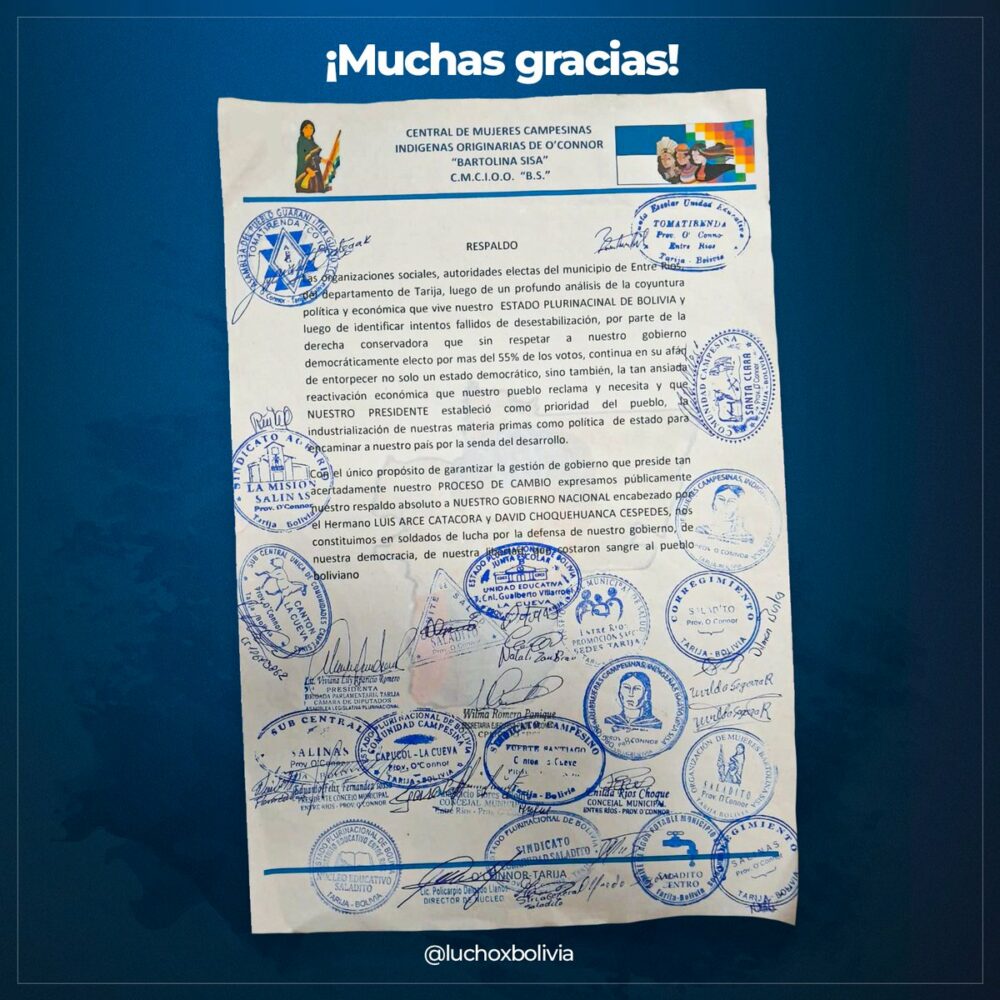 Nos sentimos fortalecidos con el decidido respaldo de nuestras hermanas de la Central de Mujeres Campesinas Indígenas Originarias de O’Connor Bartolina Sisa de #Tarija. ¡Gracias hermanas! https://t.co/mQR0ihgVIY