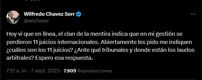 🔵 #ANF | Wilfredo Chávez, exprocurador del Estado, niega que en su gestión se perdieran 11 juicios internacionales. «Abiertamente les pido me indiquen ¿cuáles son los 11 juicios? ¿Ante qué tribunales y donde están los laudos arbitrales? Espero esa respuesta», tuiteó. https://t.co/lZnaFxlQqy