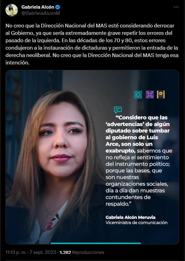 🔵 #ANF | Gabriela Alcón, viceministra de Comunicación, dice que no cree que el MAS esté considerando derrocar al Gobierno porque «sería extremadamente grave repetir los errores del pasado de la izquierda». «No creo que la Dirección Nacional del MAS tenga esa intención», tuiteó. https://t.co/ajyOOA58CY