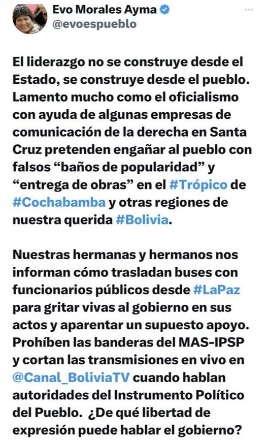 Evo denuncia “falsos baños de popularidad” de Arce. Y reclama “libertad de expresión”.