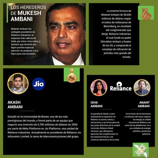 Al día de hoy, 🪙 MukeshAmbani es el Director General de RelianceIndustries, empresa que fundó su padre Dhirubhai Ambani a finales de los 50, pero ya se prepara una sucesión👴🏼