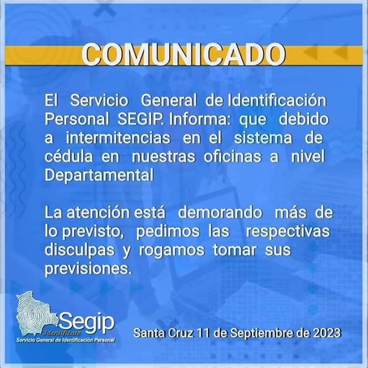Esta situación que fue reportada por los usuarios esta mañana, obligó a la institución a pedir disculpas a los usuarios, pidiendo tomar previsiones porque el trámite de carnet de identidad está demorando más de lo acostumbrado.