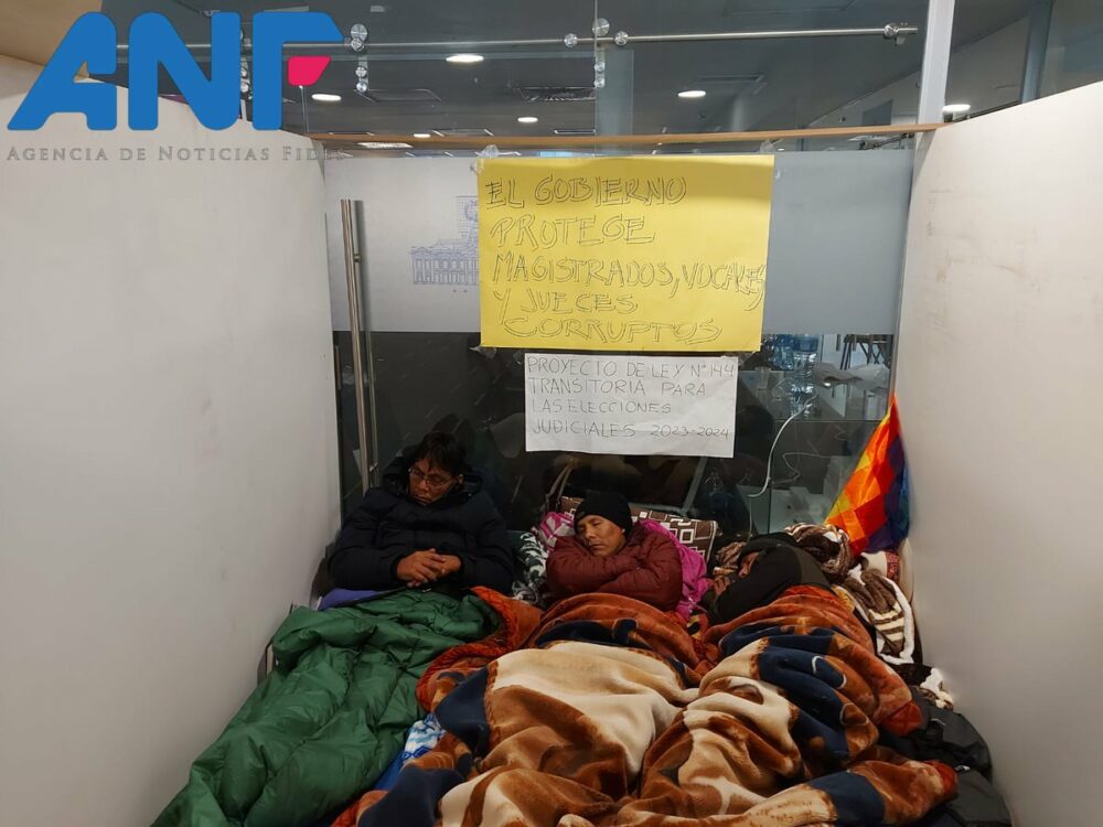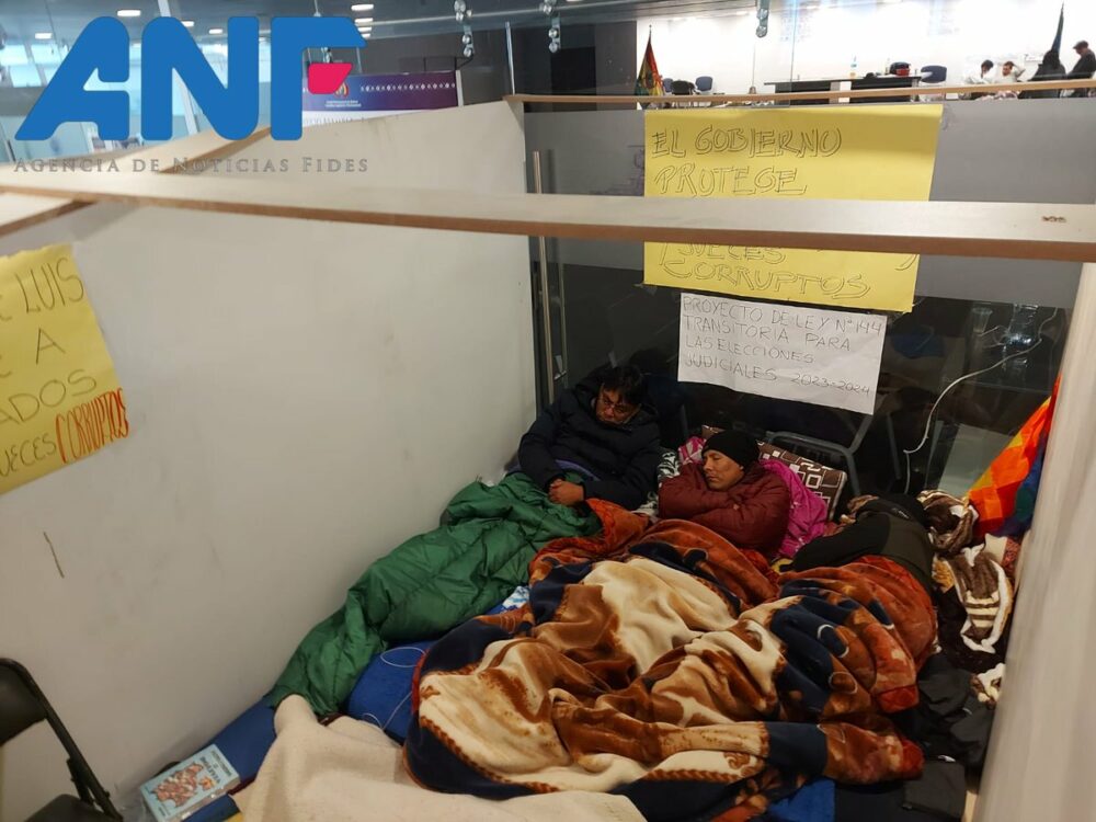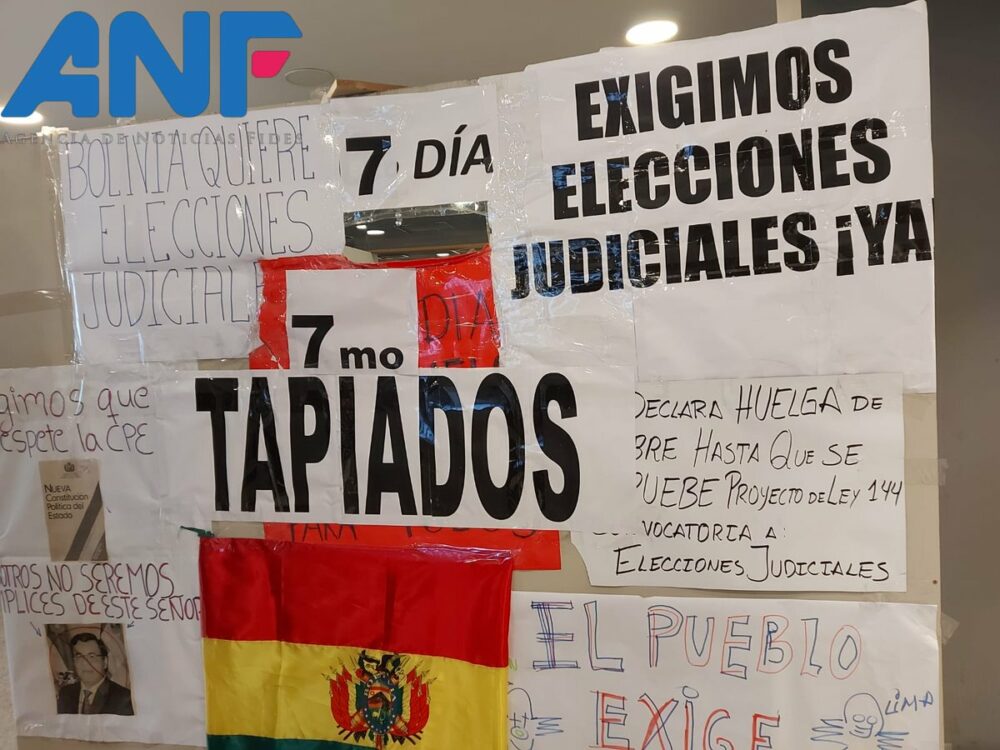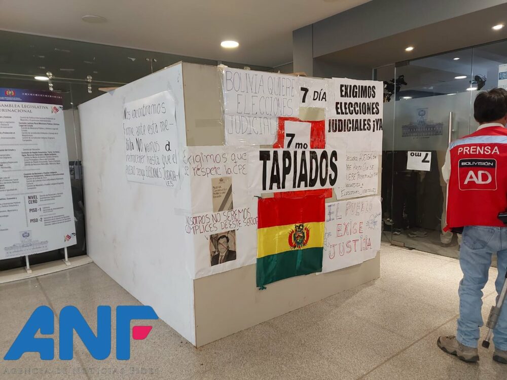 🔵 #ANF | #LaPaz Asambleístas «evistas» cumplen el séptimo día de huelga de hambre en instalaciones de la ALP en demanda de que la Cámara de Diputados apruebe el proyecto de ley transitoria para las elecciones judiciales. https://t.co/7UYMRgQkRD