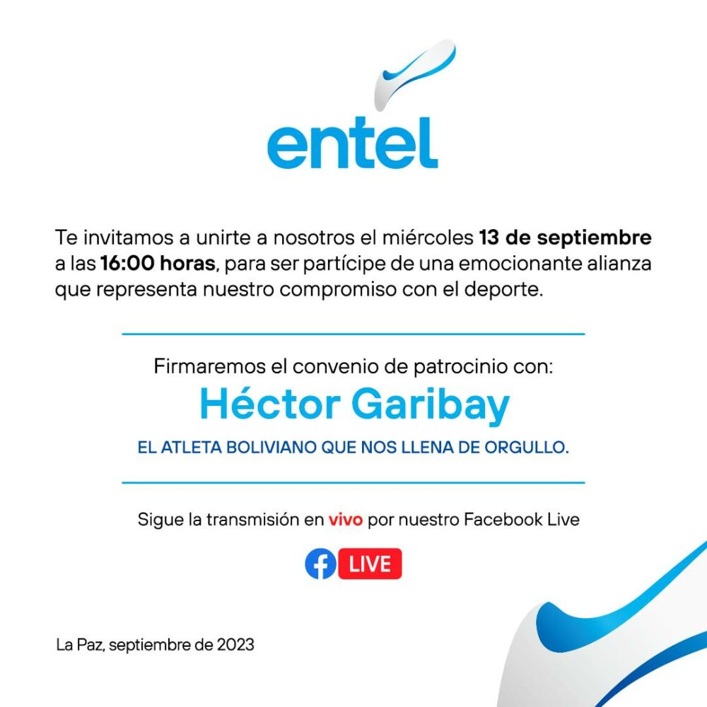 🔵 #Ultimo | @entelbo invita a la ciudadanía a unirse a una transmisión en vivo a las 16.00 de hoy, en Facebook, para presenciar la firma de un patrocinio con el atleta Héctor Garibay, quien rompió un récord y consiguió el primer lugar en la maratón de Ciudad de #Mexico. https://t.co/EE1sMJx1zv