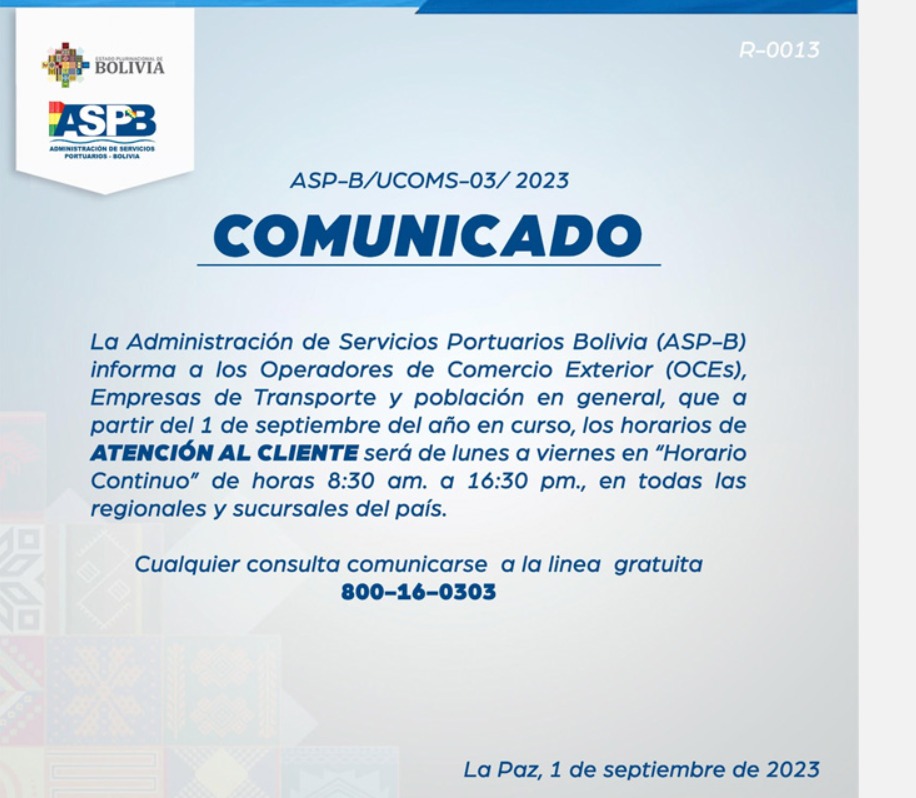 🔵 #ANF | La Administradora de Servicios Portuarios #Bolivia (ASP-B) informó que a partir del 1 de septiembre los horarios de atención al cliente serán en horario continuo en todas las regionales y sucursales del país. https://t.co/m9wWti5fAO