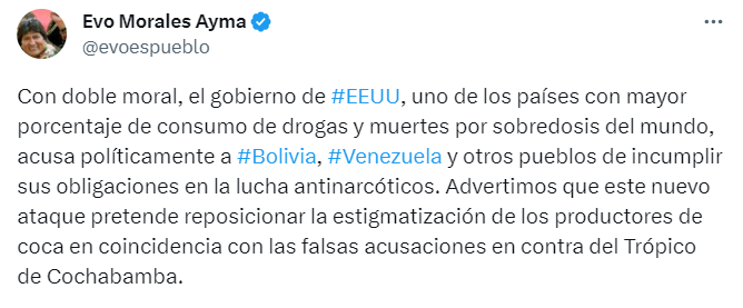 #ANF El expresidente y líder del Movimiento Al Socialismo (MAS), Evo Morales calificó de “doble moral” el informe de Estados Unidos que descertifica a Bolivia en la lucha contra el narcotráfico. https://t.co/fLRj3CtgUs