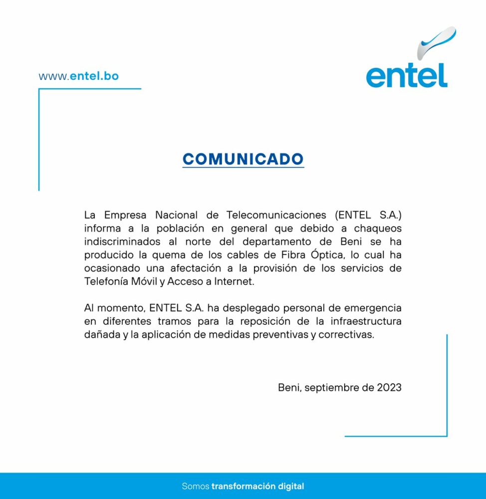 🔵 #ANF | @entelbo informa que debido a los chaqueos registrados en el norte del #Beni se quemaron cables de fibra óptica, por lo cual los servicios de telefonía móvil y acceso de internet se encuentran inhabilitados. https://t.co/df71dbeOZA