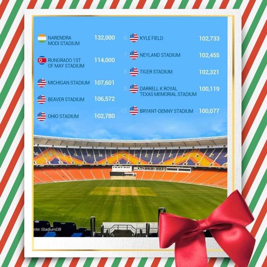 DONDE LAS HINCHADAS SON FELICES El 🏟️ Narendra Modi, que lleva el nombre del primer ministro de India, fue diseñado para albergar partidos de cricket y es el de mayor capacidad en el mundo. El cricket es considerado como el segundo deporte más popular del mundo, sólo superado por el futbol. El puesto número dos 🥈 lo ocupa el Estadio Rungrado 1 de Mayo, que está ubicado en Corea del Norte. Se completó en 1989 con el propósito de recibir el Festival Mundial de la Juventud y los Estudiantes; ahora se utiliza para albergar varios eventos gubernamentales. El resto de los estadios 🏟️ de la lista se encuentran en Estados Unidos 🖇️ y todos son recintos de fútbol 🏈 americano universitario.