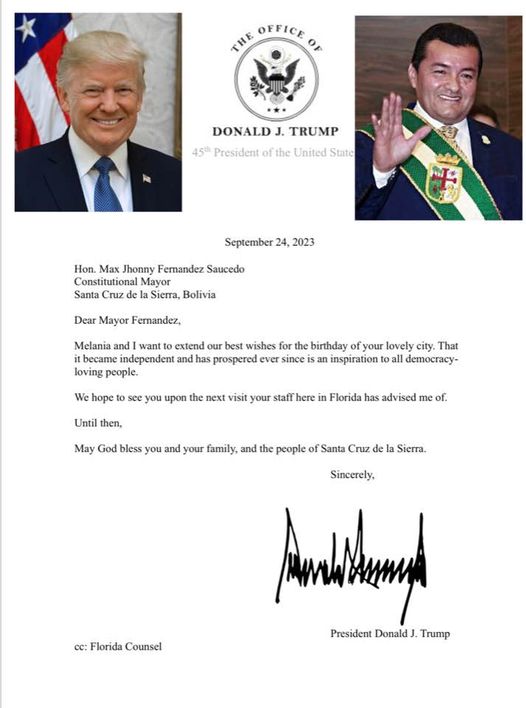Trump le escribe a Johnny. Y lo felicita en su nombre y en el de su esposa Melania por el aniversario de Santa Cruz. Y le dice que espera verlo cuando vaya a EEUU.