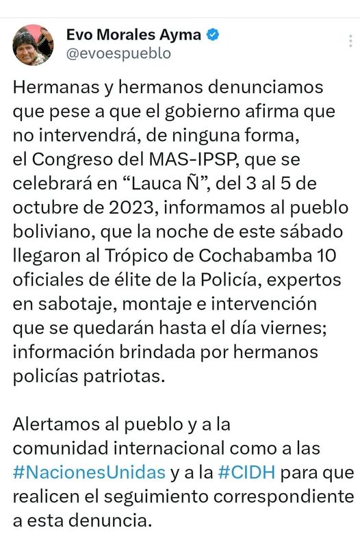 Evo dice que policías «patriotas» le informaron la llegada de 10 oficiales de elite de la policía al trópico expertos en Sabotaje, montaje e intervención que se quedaran hasta el día viernes en esa región.