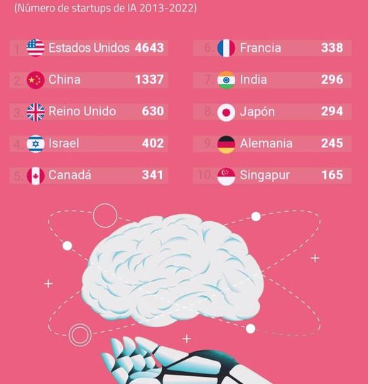de Inteligencia Artificial 🧠 La inteligencia artificial está en boca de todos desde finales del año pasado y prácticamente cada semana conocemos la llegada de una nueva utilidad o herramienta basada en la automatización 🦾 Con la IA generativa en plena ebullición también han aflorado multitud de startups de este negociado. La inversión en Inteligencia Artificial 🧠 ha ganado popularidad en la última década, y Estados Unidos y China son los principales países donde se han creado más startups de IA, invirtiendo alrededor de 250 mil millones de dólares 💲 en fondos. Según el AI Index 2023 Annual Report 📝, estos son los países con más startups de Inteligencia Artificia🧠 🤯 La metodología sólo tomó en cuenta empresas que han recibido más de 1.5 millones de dólares de inversión. F: elCEO/espresso.es 📀Solo el año pasado nacieron 524 startups de inteligencia artificial en EE.UU, atrayendo una inversión de 47.000 millones de dólares.
