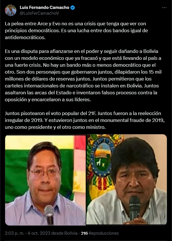 🔵 #ANF | Luis Fernando #Camacho, gobernador de #SantaCruz, dice que la pelea entre Luis Arce y Evo Morales no es una crisis que tenga que ver con principios democráticos porque «gobernaron juntos». «Es una disputa para afianzarse en el poder y seguir dañando a #Bolivia», tuiteó. https://t.co/JT0jhyDfkW