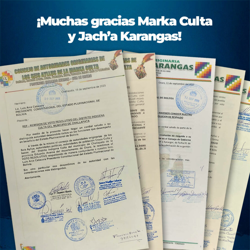 A las y los hermanos de los Ayllus y Markas de la Nación Originaria Suyu Jach’a Karangas y los Ayllus de la Marka Culta, #Oruro, gracias por su respaldo. Con unidad demostraremos que el Instrumento Político es más fuerte que intereses individuales o de grupo. https://t.co/F1MagN0OUC