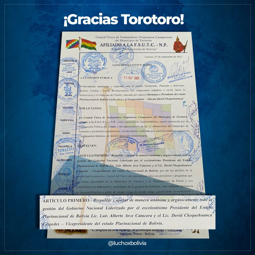 Ante las mentiras y los constantes ataques propios de la vieja forma de hacer política, nuestra respuesta siempre será gestión y trabajo por el pueblo boliviano. Con su apoyo, seguimos adelante Central Única de Trabajadores Originarios Campesinos de Torotoro, #Potosí. ¡Gracias! https://t.co/OGMh4dhJz2