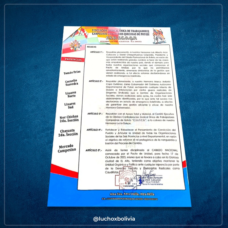 Gracias Federación Sindical Única de Trabajadores Campesinos Originarios Quechuas de #Potosí. https://t.co/0zI77OTwUJ