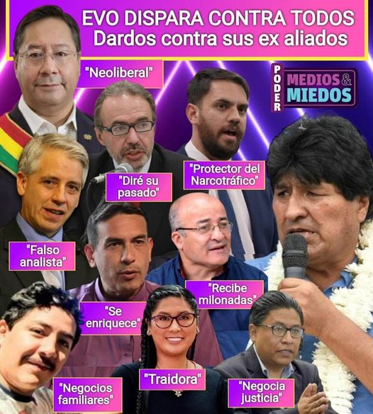 Evo dispara contra todos. Contra todos sus ex aliados que hoy no lo apoyan. Miren lo que les dice. Neoliberal, protector del narcotráfico, falso analista, traidora, se enriquece, recibe millonadas, hace negocios familiares, negocia la justicia, diré su pasado. Evo, con todo y contra todos.