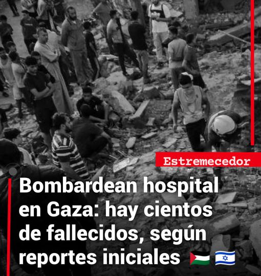 APUNTAN A ATAQUE 💥 INTERNO 👁️ Israel dijo que la explosión fue por un cohete fallido de la Yihad Islámica. Las autoridades de la organización terrorista Hamas culparon a las fuerzas de seguridad israelíes Ejército 🪖 israelí: «La inteligencia muestra que el grupo Jihad Islámico Palestino es responsable del ataque al hospital. Un bombardeo de cohetes de Gaza hacia Israel pasó cerca del hospital cuando fue alcanzado».