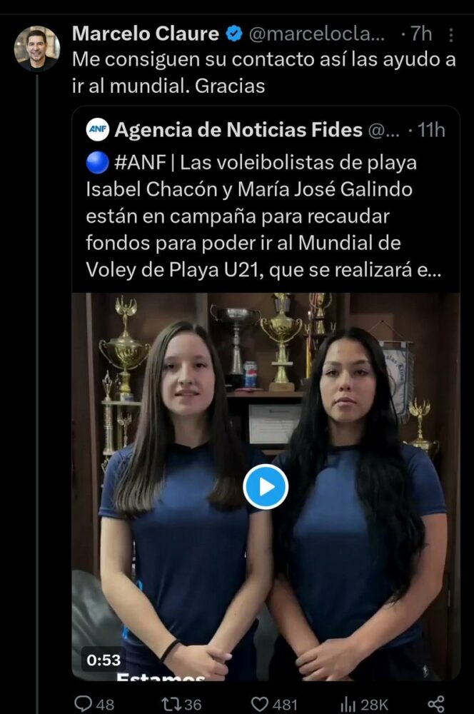 🔵 #ANF El empresario y presidente de @Bolivar_Oficial, @marceloclaure, expresó su intención de ayudar a las voleibolistas de playa Isabel Chacón y MarÃa José Galindo para que participen del Mundial de Voley de Playa U21 en representación de #Bolivia. https://t.co/bJanknRXSy