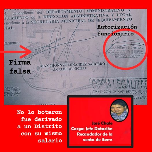 A pesar de que las autoridades ya conocen los delitos cometidos, el Sub Director de RRHH se quedó en el cargo; recibió la absoluta confianza del Secretario de Finanzas y el funcionario José Chale solo fue derivado a un Distrito municipal con el mismo item y el mismo salario.