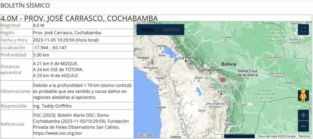 🔵#ANF | #Sociedad El Observatorio San Calixto registró a las 10:30 de este domingo un evento sísmico de 4 grados de magnitud en la escala de Richter, en la provincia Carraco del departamento de #Cochabamba. https://t.co/sXjzUEb8vA