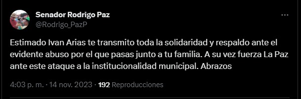 馃數 #ANF | El senador de CC Rodrigo Paz se solidariz贸 con el alcalde de #LaPaz tras conocer que fue enviado a detenci贸n domiciliaria. 芦A su vez fuerza #LaPaz ante este ataque a la institucionalidad municipal禄, escribi贸 en su cuenta X. https://t.co/0QZu8TFgJQ