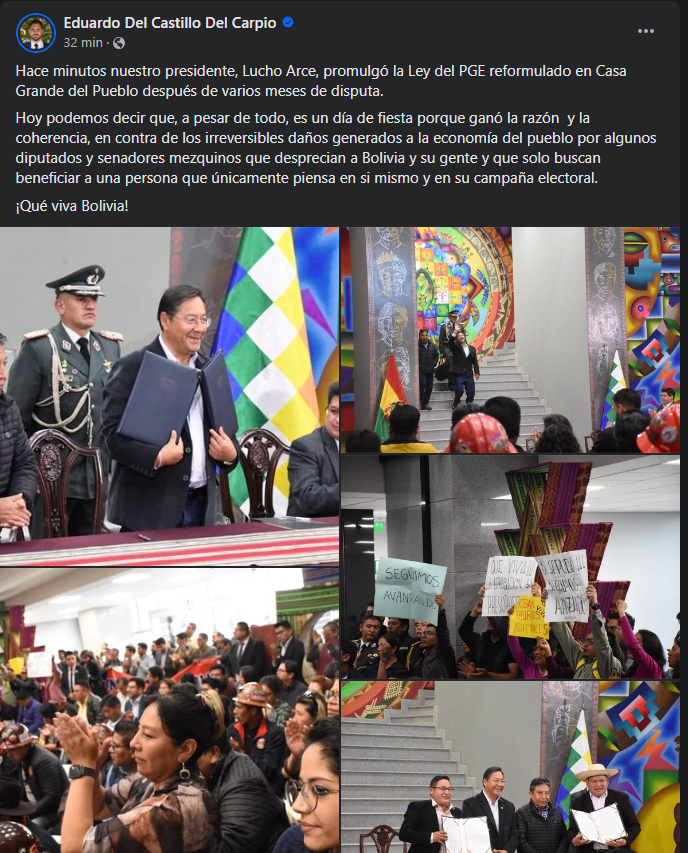 🔵 #ANF | Eduardo Del Castillo, ministro de Gobierno, dice que «hoy es un día de fiesta» por la promulgación de la Ley de Modificaciones al PGE 2023. «Ganó la razón y la coherencia», escribió en sus redes sociales. https://t.co/RqOkjfNDIx