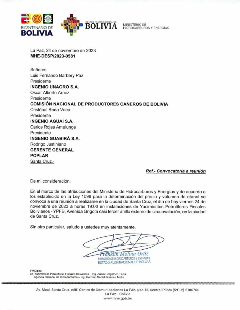 🔵 #ANF | Franklin Molina, ministro de Hidrocarburos y Energías, extendió una nueva convocatoria al sector cañero y sucroalcoholero para reunirse este viernes por la noche en #SantaCruz con el objetivo de definir el precio de compra del etanol. https://t.co/P8t7DNYXaj