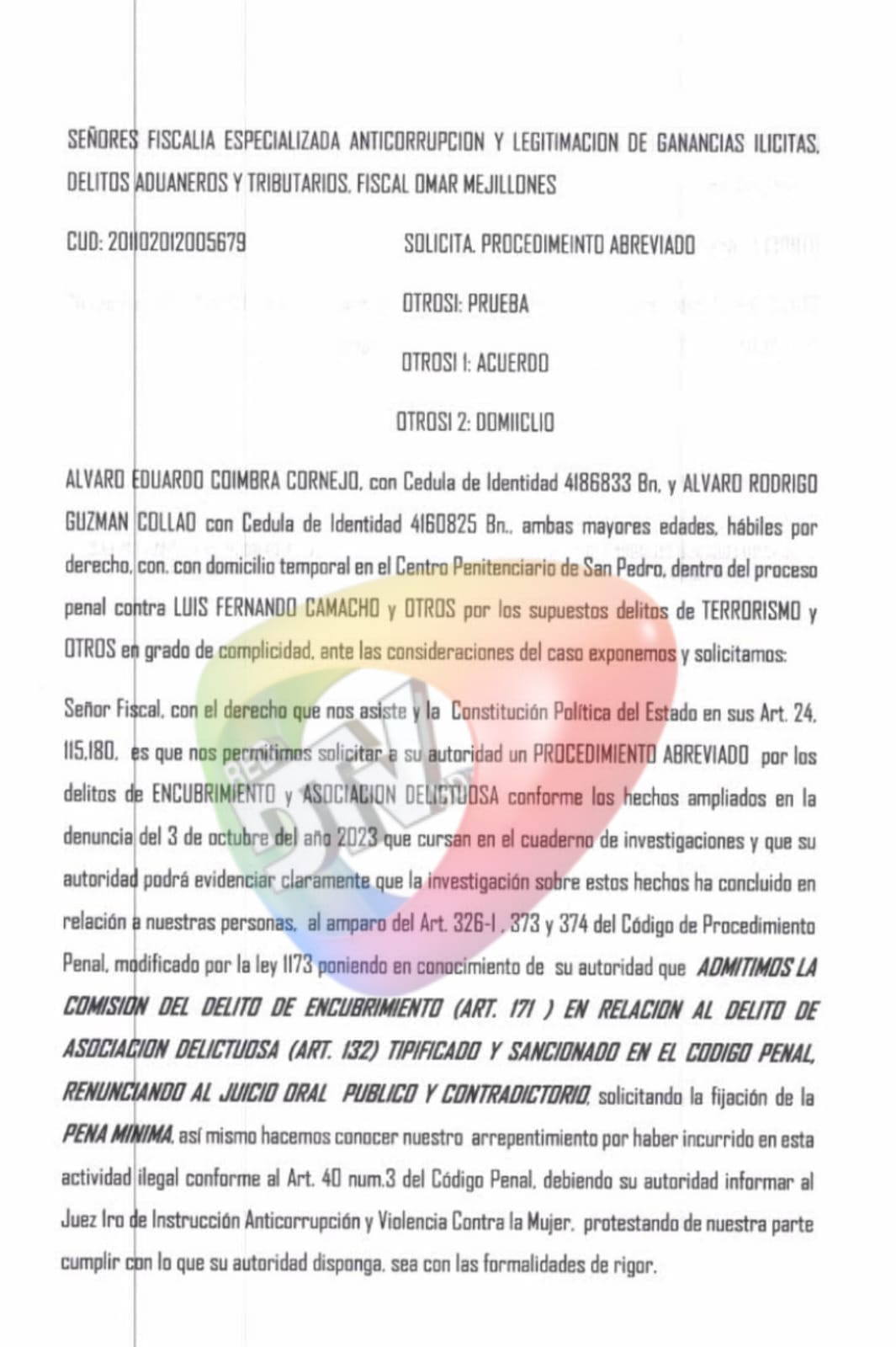 Se trata de los exministros Alvaro Coimbra y Alvaro Rodrigo Guzmán quienes están acusados dentro del caso denominado Golpe de Estado en grado de complicidad los mismos hicieron llegar un memorial a Fiscalía solicitando el proceso abreviado.
