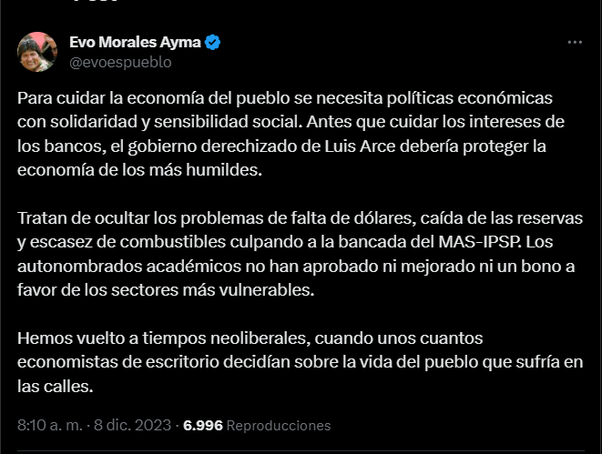 🔵 #ANF | Evo Morales afirma que #Bolivia regresó a tiempos neoliberales cuando «unos cuantos economistas de escritorio» decidían sobre la vida del pueblo. «Los autonombrados académicos no han aprobado ni mejorado ni un bono a favor de los sectores más vulnerables», tuiteó. https://t.co/UsBkMpAoB0