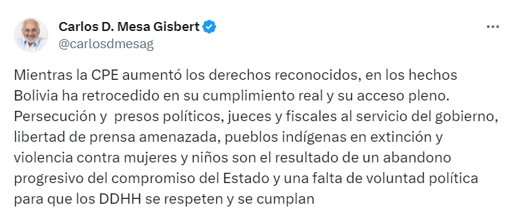 #ANF El líder de Comunidad Ciudadana (CC), Carlos Mesa, señaló que Bolivia ha retrocedido en el cumplimiento real y acceso pleno a los derechos reconocidos en la nueva Constitución Política del Estado. 👇 https://t.co/a2BiaMgXpG