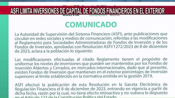 La ex directora de la ASFI, Lenny Valdivia informó que el Gobierno a través de la Autoridad de Supervisión del Sistema Financiero (ASFI) lo que busca es evitar que gran cantidad de dólares salgan del país con la medida que asumió la ASFI sobre Fondos de Inversión a tener un máximo del 5% de su cartera invertidos en el extranjero; en caso de tener más, deberían venderlo y que los dólares de los privados se queden en Bolivia.