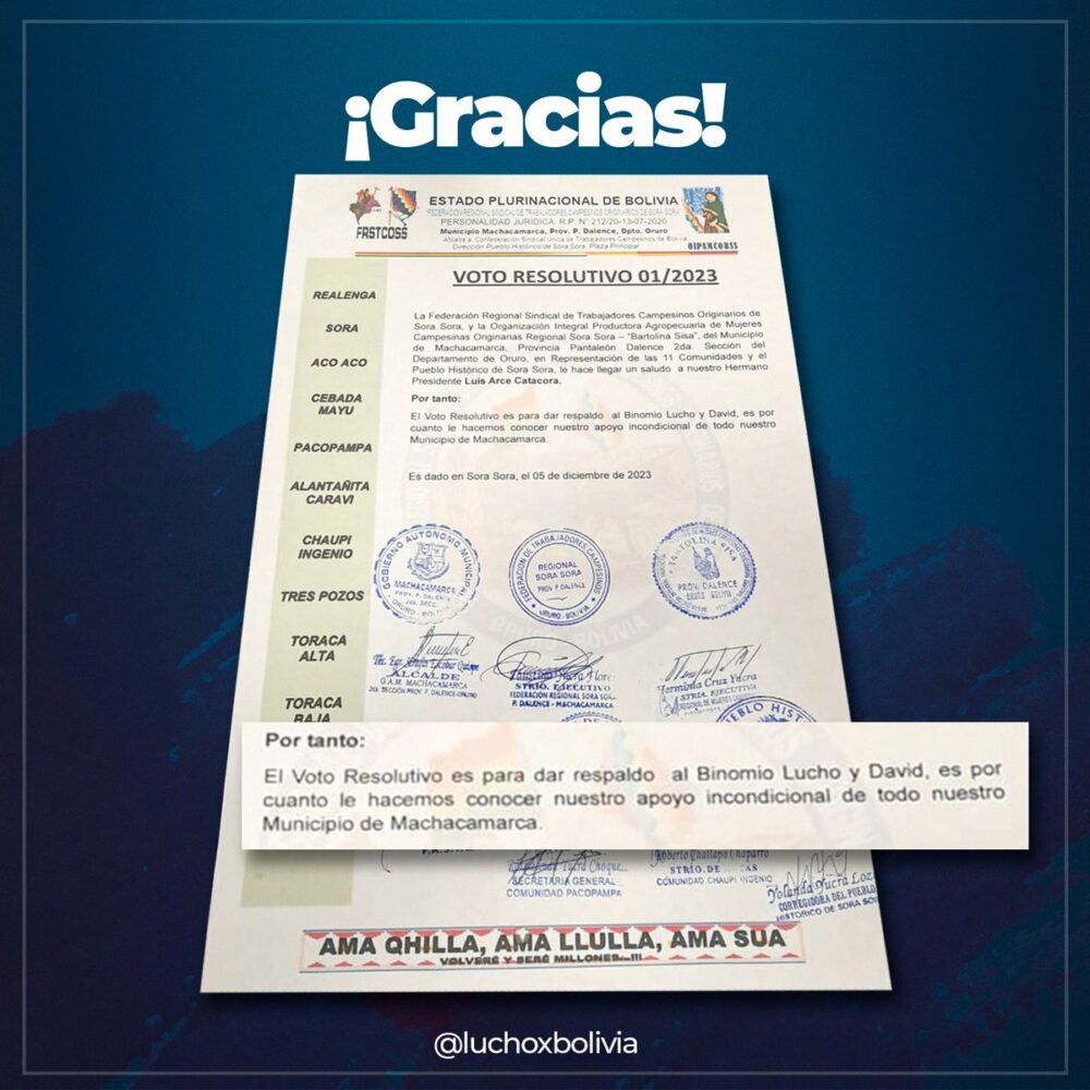 No nos cansamos de agradecer el apoyo de nuestras organizaciones sociales. A las hermanas y hermanos de la Federación Regional Sindical de Trabajadores Campesinos Originarios de Sora Sora, en #Oruro, muchas gracias por su respaldo. https://t.co/nM3qaNs0Gk