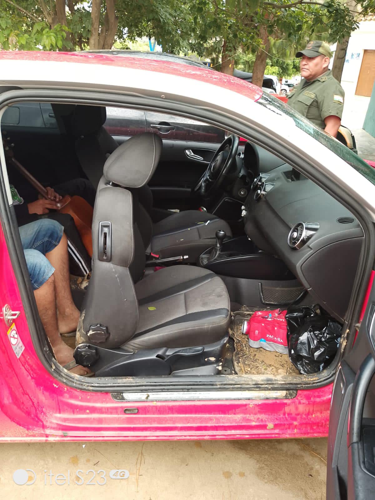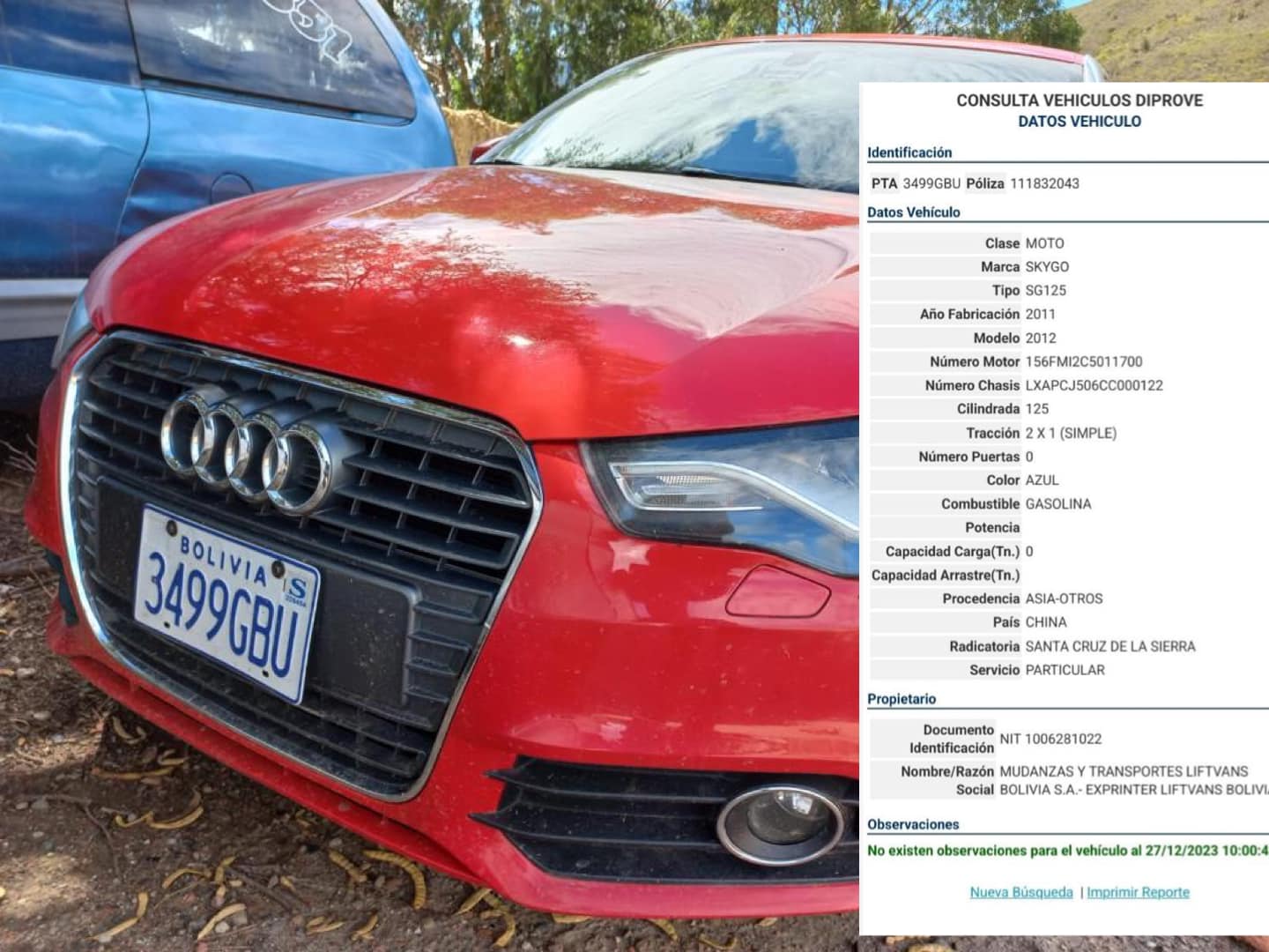 El Audi rojo de lujo es robado y circulaba con placa de moto robada. Se complica la situación del hijo del subgobernador de Comarapa (Provincia Manuel María Caballero).
