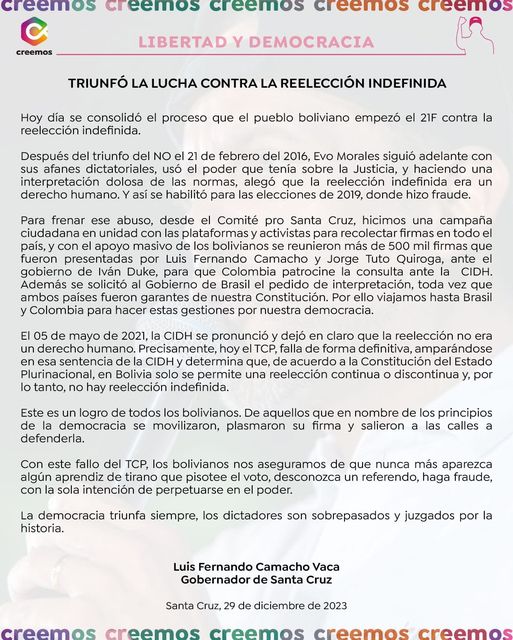 Evo inhabilitado. No podrá volver a buscar la presidencia de Bolivia. Acaba de fallar el Tribunal Constitucional. Lo hizo este viernes 29 de diciembre. Luis Fernando Camacho festeja. Estuvo en cada paso de la