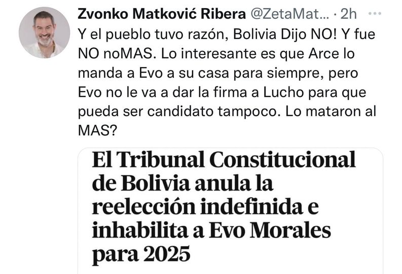 Zvonko Matkovic ante fallo TCP: “Lo interesante es que Arce lo manda a Evo a su casa para siempre”