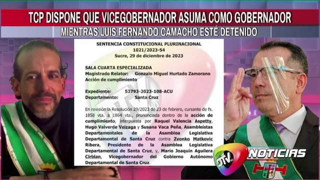 El Tribunal Constitucional Plurinacional a través de su Sala Constitucional Cuarta emitió la sentencia 1021/2023 de 29 de diciembre del 2023 mediante la cual dispone que el actual Vicegobernador, Mario Joaquín Aguilera Cirvian, asuma de INMEDIATO como Gobernador en suplencia legal de Luis Fernando Camacho Vaca en tanto el actual Gobernador guarde detención preventiva en la cárcel de Chonchocoro.