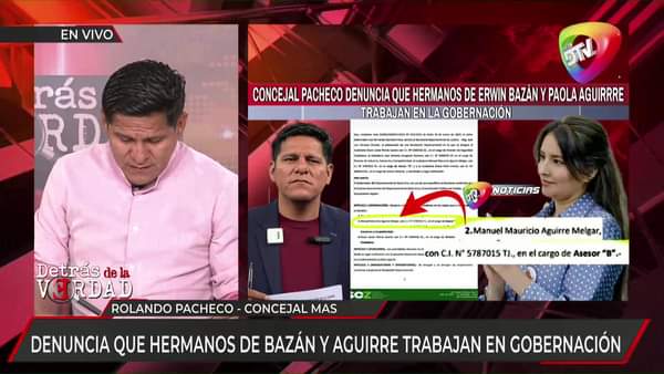 El concejal del MAS, Rolando Pacheco, denuncia que hay nepotismo y corrupción en la gobernación de Santa Cruz y con documentos en mano asegura que la asambleísta Paola Aguirre y el diputado Erwin Bazán, tienen familiares “en los mejores cargos” dentro de la gobernación.