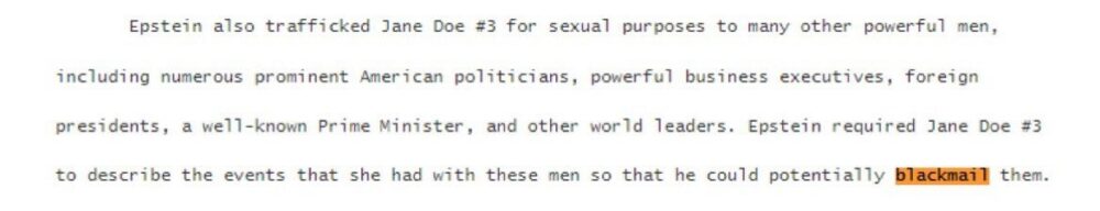🇺🇸 | Revelación en los documentos de Epstein: Víctima afirma que Epstein buscaba influir en políticos estadounidenses, ejecutivos, presidentes extranjeros y un Primer Ministro, para posibles chantajes. https://t.co/PJT6ohHmzJ