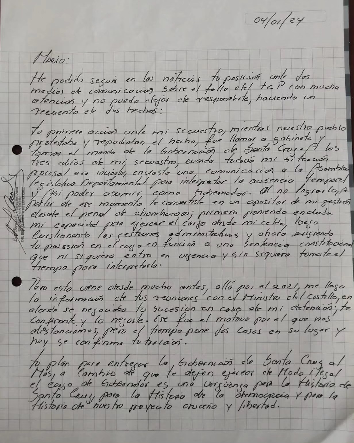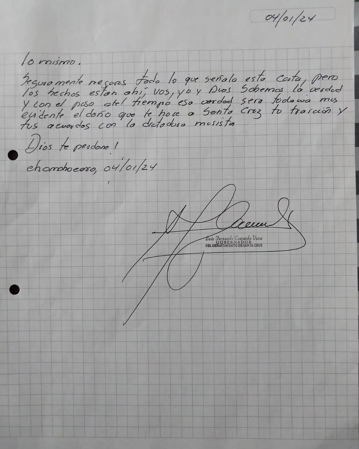 Seguramente negarás todo lo que señala esta carta, pero los hechos están ahí, vos, yo y Dios, sabemos la verdad y con el paso del tiempo esa verdad será todavía más evidente el daño que le hace a Santa Cruz tu traición y tus acuerdos con la dictadura masista.