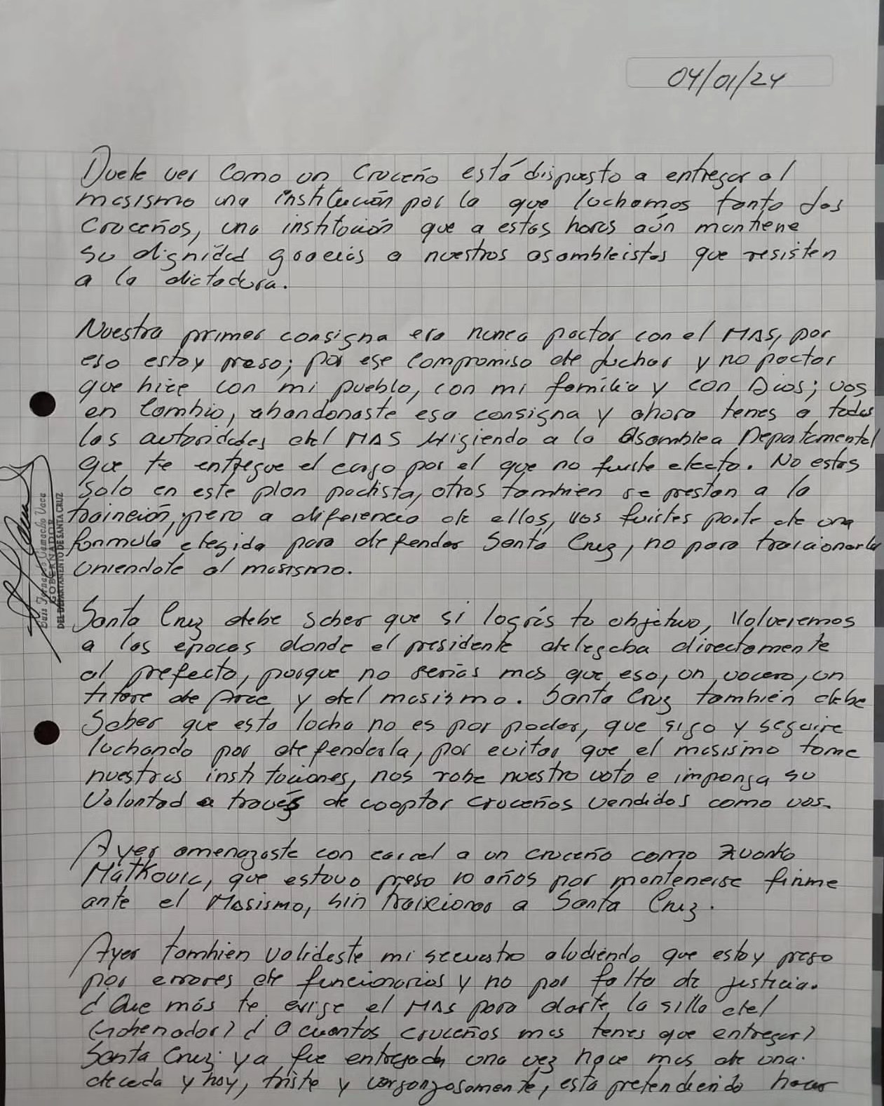 Nuestra primer consigna era nunca pactar con el MAS, por eso estoy preso; por ese compromiso de luchar y no pactar que hice con mi pueblo, con mi familia y con Dios; vos en cambio, abandonaste esa consigna y ahora tenés a todas las autoridades del MAS exigiendo a la Asamblea Departamental que te entregue el cargo por el que no fuiste electo. No estás solo en este plan pactista, otros también se prestan a la traición, pero a diferencia de ellos, vos fuiste parte de una fórmula elegida para defender Santa Cruz, no para traicionarla uniéndote al masismo.