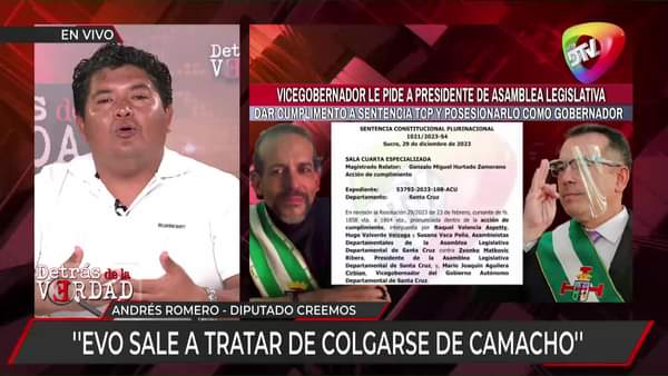 El diputado de Creemos, Andrés Romero, en defensa del Gobernador Luis Fernando Camacho dijo que Creemos lo que hará es defender el voto de la población cruceña que votó por Luis Fernando Camacho como gobernador de Santa Cruz.