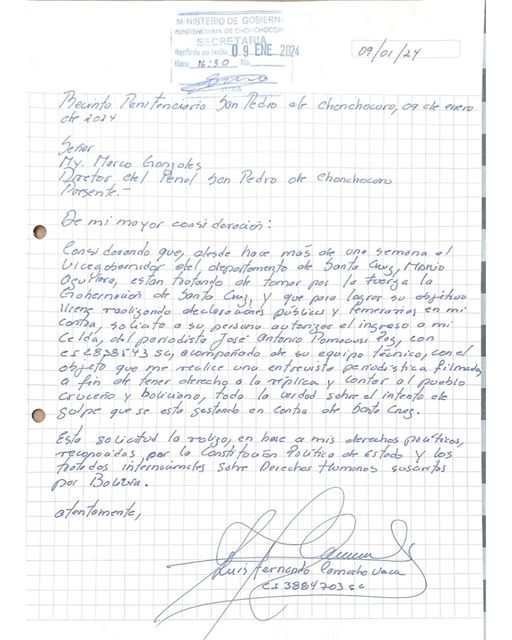de una semana el Vicegobernador del Departamento de Santa Cruz, Mario Aguilera, está tratando de tomar por la fuerza la Gobernación de Santa Cruz, y que para lograr su objetivo viene realizando declaraciones públicas y temerarias en mi contra, solicito a su persona autorizar el ingreso a mi celda, del periodista José Antonio Pomacusi Paz, conCI 2838543 SC, acompañado de su equipo técnico, con el objeto que me realice una entrevista periodística filmada, a fin de tener derecho a la réplica y explicar de forma directa al pueblo cruceño y boliviano, todos los alcances de esta crisis que se está gestando en Santa Cruz.