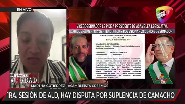 miércoles, la asambleísta Martha Gutiérrez, dijo que no se tratará el punto de la sucesión temporal del gobernador Luis Fernando Camacho, como solicitan desde el MAS y un ala de Creemos.La asambleísta explicó que la sesión de inauguración está convocada para las 16:00 de este miércoles, pero ese tema no será tratado porque se espera una respuesta a la consulta que se realizó al TCP con respecto al temas.