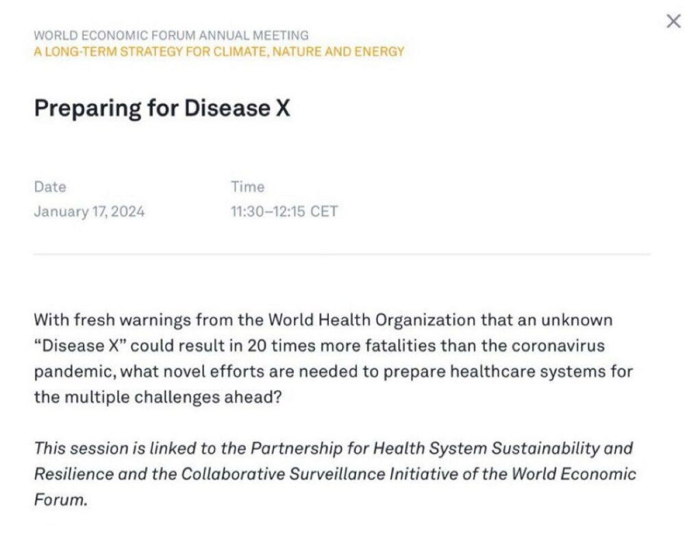 🚨 | ÚLTIMA HORA: En la reunión anual de Davos, el Foro Económico Mundial abordará el tema de «Enfermedad X» el próximo 17 de enero, alertando que podría tener un impacto 20 veces mayor que la pandemia de coronavirus en cuanto a fatalidades. https://t.co/vyQ6abfY7m