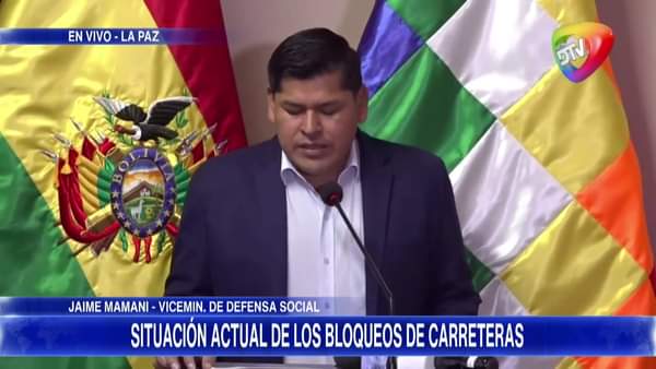 Viceministro de defensa social y sustancias controladas Jaime Mamani da una conferencia de prensa donde informa sobre la situación actual de los bloqueos en las carreteras, donde reporta 24 puntos de bloqueos.