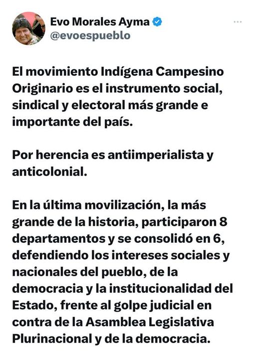 Evo dice que se movilizaron 8 departamentos. Y que fue “frente al golpe judicial”Categorías NoticiasEtiquetas , Facebook, Pepe Pomacusi Periodista 03/02/2024 Fuente: Pepe Pomacusi Periodista